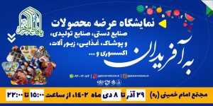 پایگاه خبری سلام بازار، نمایشگاه عرضه محصولات صنایع دستی، صنایع تولیدی و پوشاک،غذایی و زیور آلات از ۲۹آذر ماه لغایت ۸ دی ماه در مجتمع امام خمینی دایر شده است.